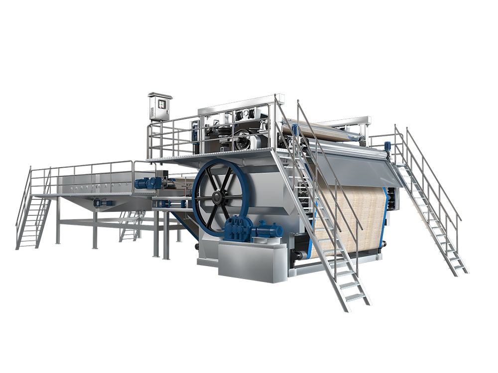 本產品為公司在多年實踐的基礎上,自主研發的產品。主要用于對各類漿料進行洗滌、濃縮、固液分離及濾液提取。采用多壓區,壓力逐級加大,出漿濃度高;通過調整網速、線壓力,提高脫水量和出漿濃度;脫出的濾液濃度低,纖維損失少。