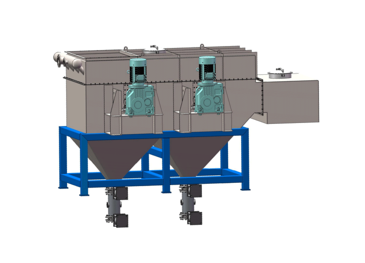 轉鼓在驅動裝置下進行旋轉,同時泵入大量的洗滌水,料片從進料口進入后,在洗鼓推動水流的作用下不斷進行翻滾和前進,水流把料片上的灰塵雜質清洗干凈,比重較大的雜質,例如鐵塊、不銹鋼零件、石塊、秸稈種子等落入下方的重物收集槽內定時排放,洗干凈的料片隨著水流落到后續的脫水設備上進行固液分離工序。